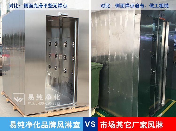 1、風淋室的材質:首先從材質上分類主有彩鋼板,鋼板型風淋室和不銹鋼風淋室三種主流材質。其中彩鋼板因質量較差目前已經基本不再使用,鋼板風淋室主要看材質的厚度和噴漆的過程,市場上有的采用0.8-1.0的材質厚度,這種厚度偏薄,容易變形。一般建議在1.2MM或以上的鋼板材質較佳。在噴塑上面,很多廠家都是自噴或者是到小廠家噴塑。這其中有一個最重要的環節就是需要酸洗磷化,很多廠家為了節約成本或者噴塑廠家實力不行,未經過酸洗磷化,如果缺少這個步驟,油漆本身很難與設備粘合,時間一長,很容易整場的脫漆。