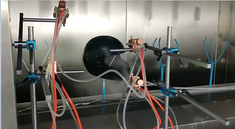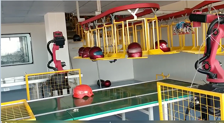 頭盔的生產(chǎn)采用塑料粒子經(jīng)過高溫熔化,經(jīng)過壓塑機的模具成型,然后經(jīng)過冷卻、上架。這個是頭盔的成型階段,成型的頭盔都是一種顏色,但實際我們市場采購和銷售的頭盔都是五顏六色,有各色花系的,這個就是本文提到的后期自動噴漆線的工藝流程,下面詳細(xì)圖文介紹凈化噴漆線的作用及安裝實際案例介紹。